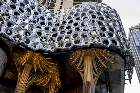 “光的声音”是澳大利亚艺术家Alexander Knox为布里斯班乔治大街300号的商业建筑设计的外立面装置。该装置以屏墙的形式环绕在三座大楼的底商外沿,为这一即将完工的高端商业综合体赋予了标志性的外观。